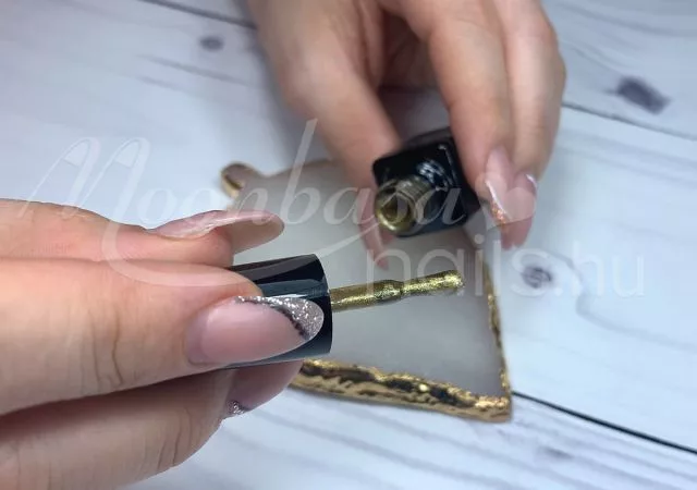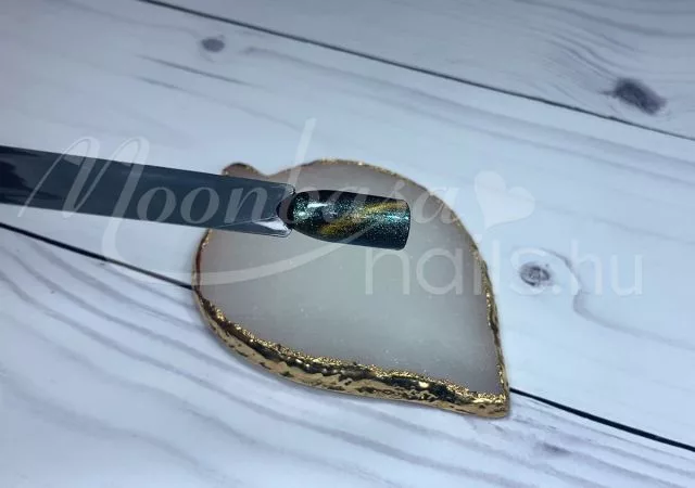A mágnes segítségével a csillámló arany szemeket egy sávba tudod vonzani, amely ezt a különleges tigrisszem hatást fogja kelteni. A Tigrisszem lakkzselé két rétegben tökéletesen fed. Az első réteget UV/LED lámpa fénye alatt köttesd meg. A második rétegen alkalmazd a mágnest megkötés előtt.
