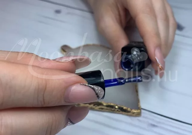A mágnes segítségével a csillámló arany szemeket egy sávba tudod vonzani, amely ezt a különleges tigrisszem hatást fogja kelteni. A Tigrisszem lakkzselé két rétegben tökéletesen fed. Az első réteget UV/LED lámpa fénye alatt köttesd meg. A második rétegen alkalmazd a mágnest megkötés előtt.