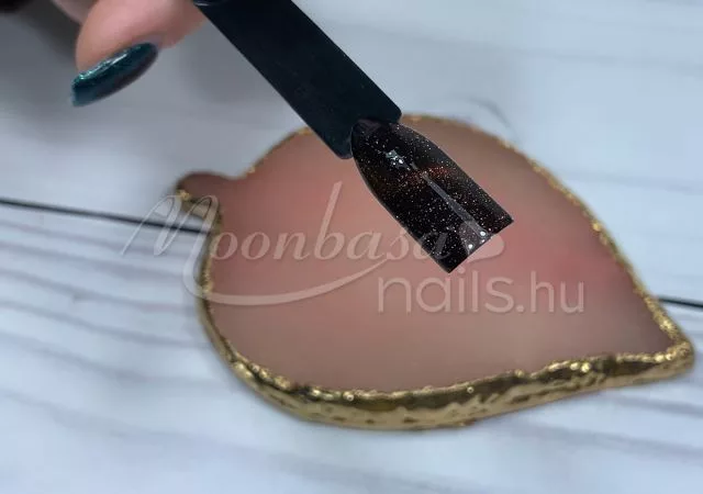 5. Még ne köttessük meg a felvitt réteget semmiképp se az UV/LED lámpánk fénye alatt! Most jön a varázslat ugyanis. Tiger eye szupererős mágnes segítségével varázsoljuk körömdíszítésünkbe a kívánt fényjátékot. Mivel már többféle mágnes is elérhető kínálatunkban és ezek használata is rendkívül sokoldalú, így ezek egyenkénti használatára itt most nem térnénk ki. A legfontosabb, hogy tartsd a mágnesedet a körömdíszítéshez olyan közel, amilyen közel csak tudod. Elegendő csak 1-2 másodpercre felmágnesezni a géllakkot, mert a minta azonnal ki fog rajzolódni.