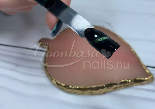 5. Még ne köttessük meg a felvitt réteget semmiképp se az UV/LED lámpánk fénye alatt! Most jön a varázslat ugyanis. Tiger eye szupererős mágnes segítségével varázsoljuk körömdíszítésünkbe a kívánt fényjátékot. Mivel már többféle mágnes is elérhető kínálatunkban és ezek használata is rendkívül sokoldalú, így ezek egyenkénti használatára itt most nem térnénk ki. A legfontosabb, hogy tartsd a mágnesedet a körömdíszítéshez olyan közel, amilyen közel csak tudod. Elegendő csak 1-2 másodpercre felmágnesezni a géllakkot, mert a minta azonnal ki fog rajzolódni.